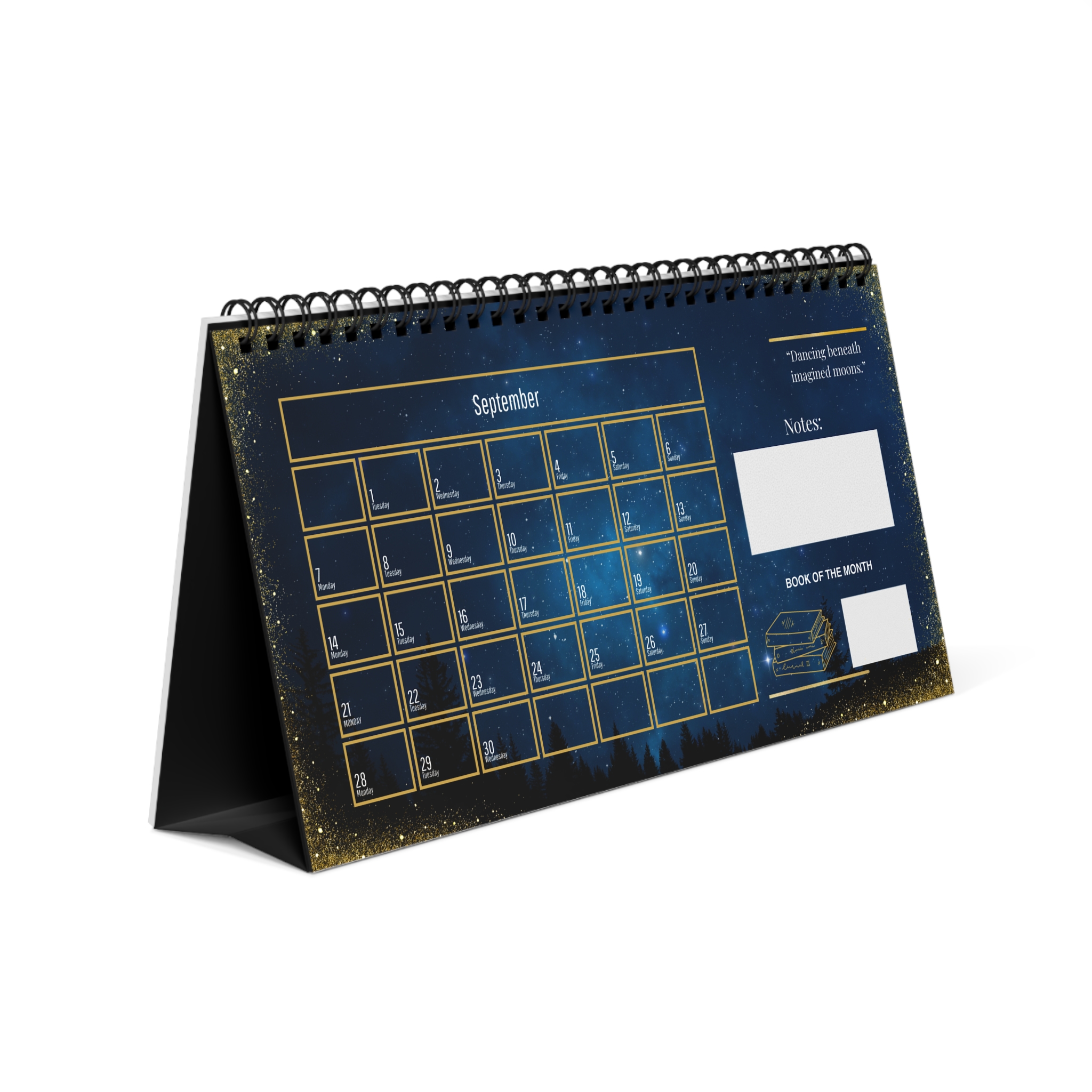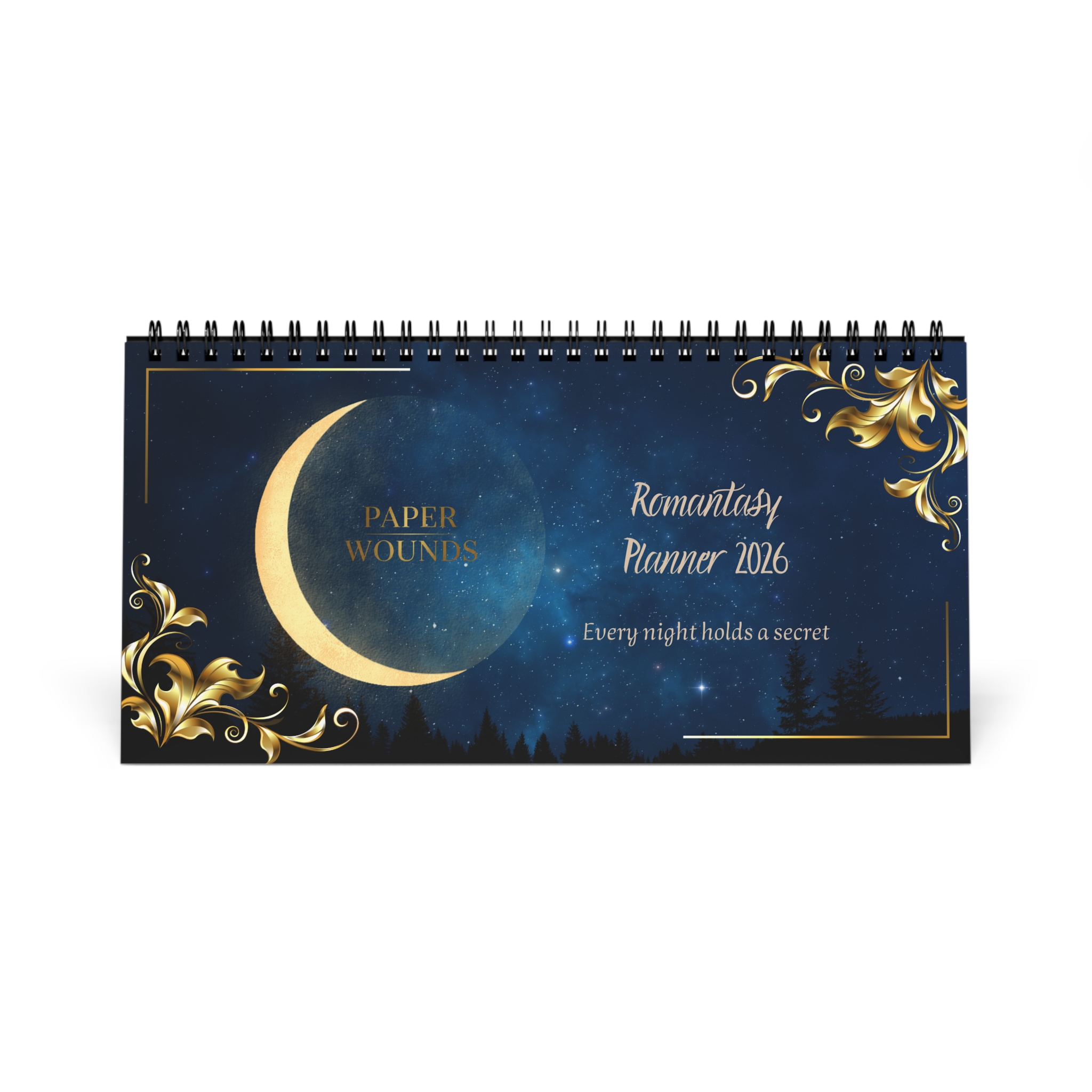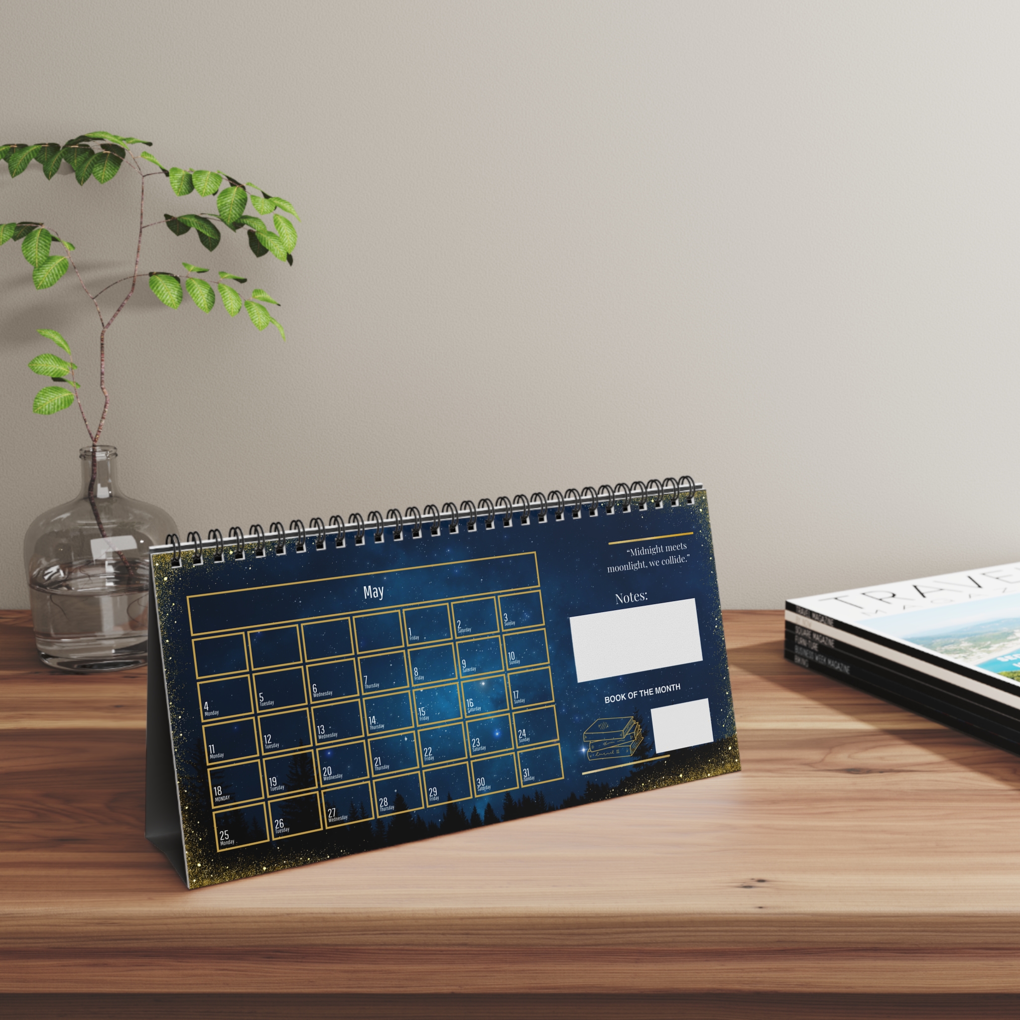 Dieser Tischkalender bringt mondbeschienene Abende und entspannte Planung direkt auf deinen Schreibtisch. Tiefe Nachtblau-Töne, ein sanft leuchtender Halbmond und filigranes Gold schaffen für jeden Monat eine ruhige, inspirierende Atmosphäre. Auf dem breiten 10" × 5" Layout bleibt genug Platz für deine eigenen Notizen – Geburtstage, Ziele oder kreative Ideen lassen sich leicht eintragen. Die Spiralbindung oben ermöglicht es, den Kalender flach liegen zu lassen oder aufrecht aufzustellen, während das robuste 270 g/m² Papier Tinte und Marker ohne Durchdrücken hält. Perfekt für gemütliche Planungssessions, ruhige Abendstunden oder das kreative Jahres-Mapping – jedes Aufschlagen lädt zu einem kleinen Moment der Ruhe und Achtsamkeit ein.